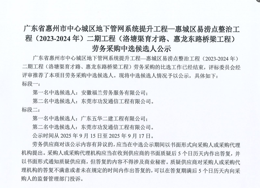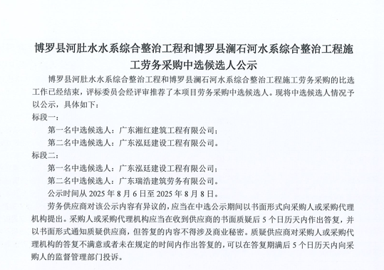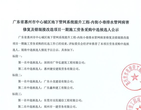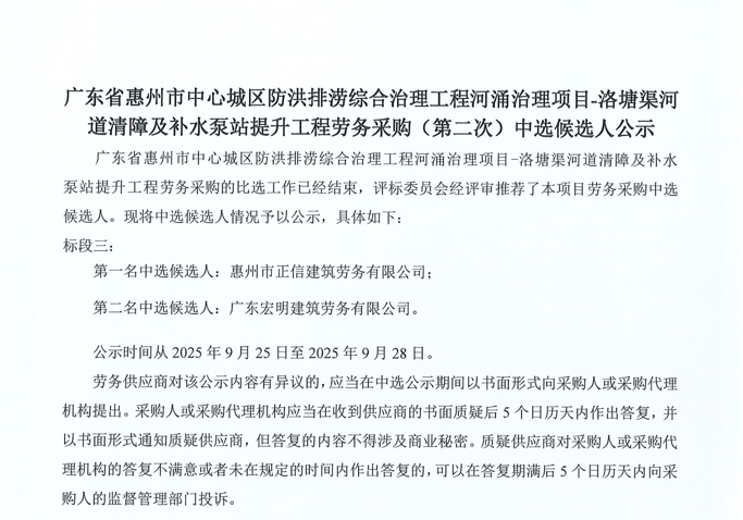 惠州市增江龍門段治理工程施工(一標段)勞務采購中選候選人公示……